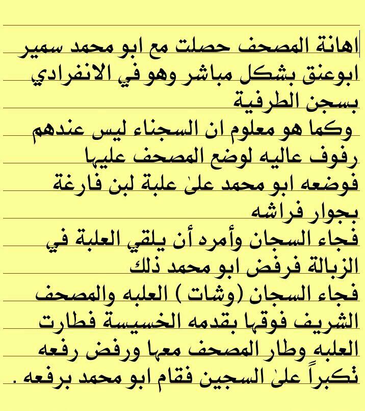 1/ليست الأولى التي تحدث في السجون ولا أظنها الأخيرة فلقد وصلتنا شهادات من ذوي السجناء بإهانة المصحف عدة مرات #حملة_الإنتصار_لكتاب_الله