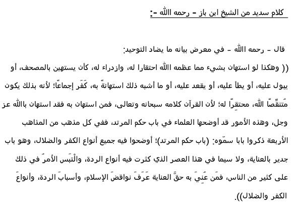 6/ وهذا قول سديد للشيخ ابن باز عن من استهان بالمصحف,